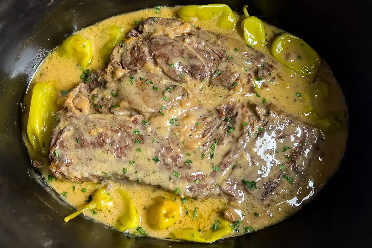 That is the whole idea here. The creamy comfort of mushroom gravy, the brightness of pepperoncini brine, and a chuck roast that still gets to do its thing low and slow.
